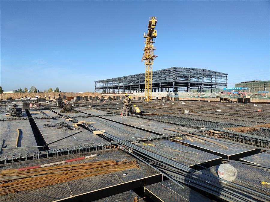 北部生態(tài)新區(qū)智能機器人標(biāo)準(zhǔn)廠房(二期)--1#、2#、5#、7#標(biāo)準(zhǔn)廠房、13#、14#甲類庫房工程項目,工人在安裝模板。