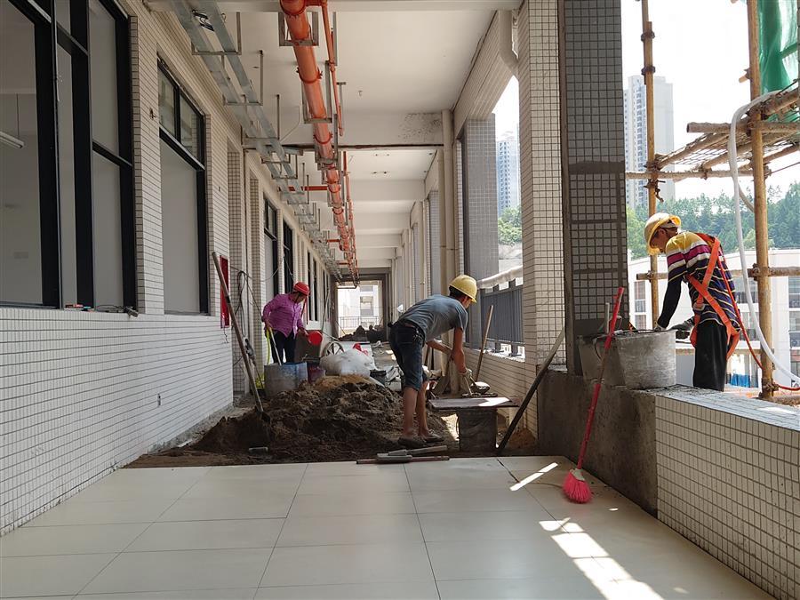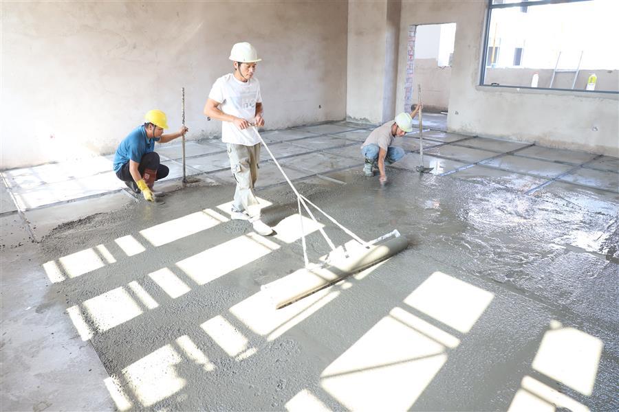 柳州市柳東新區(qū)明德中學(xué)項目,工人正在進行4#綜合樓三層水磨石拌合料鋪設(shè)。