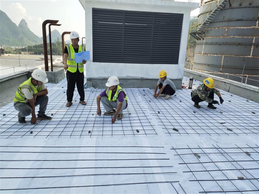 融安縣生活垃圾焚燒發(fā)電項目工程總承包項目,工人正在進行汽機間屋面鋼筋網(wǎng)綁扎。