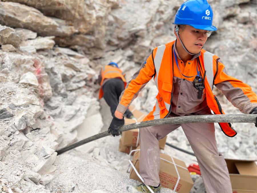 柳州市柳北區(qū)石碑坪古木村石灰?guī)r礦爆破工程,爆破作業(yè)人員正在進行裝藥、網(wǎng)絡(luò)延時設(shè)置等作業(yè)。