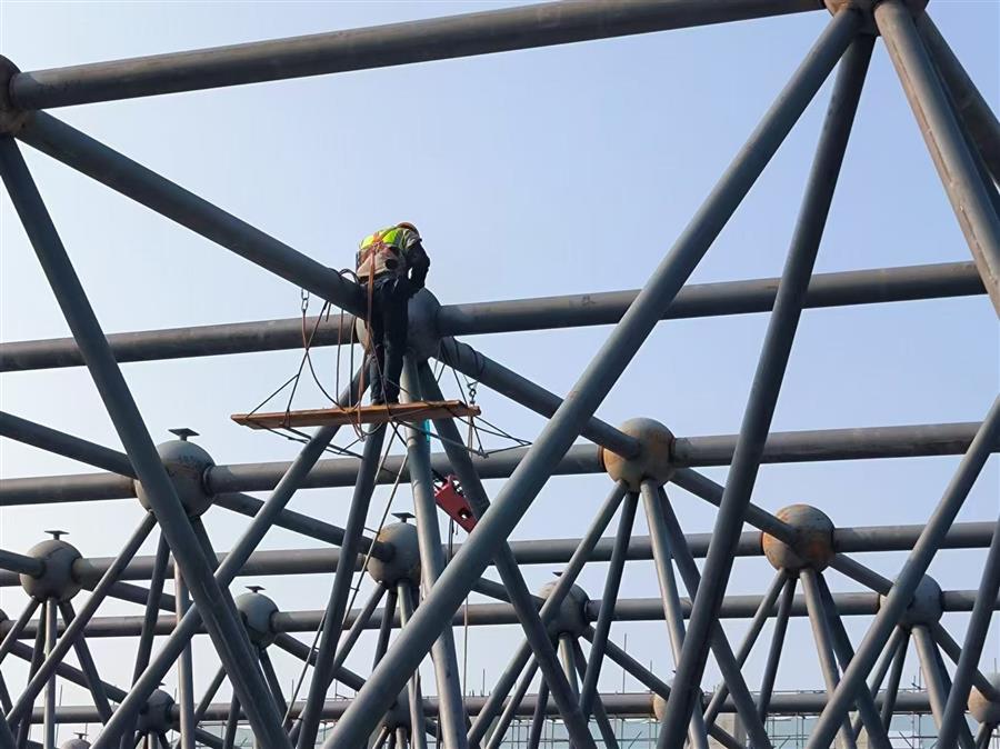 項目正在進行鋼網(wǎng)架電焊、焊口除銹、焊口探傷檢測、鋼球補漆等鋼結(jié)構(gòu)施工。為確保項目順利推進,項目部倒排工期計劃并及時根據(jù)現(xiàn)場情況更新安排,配足人力機械,加班加點,齊心協(xié)力,全員投入推進項目建設(shè)。目前,已完成拼裝任務(wù)的50%。