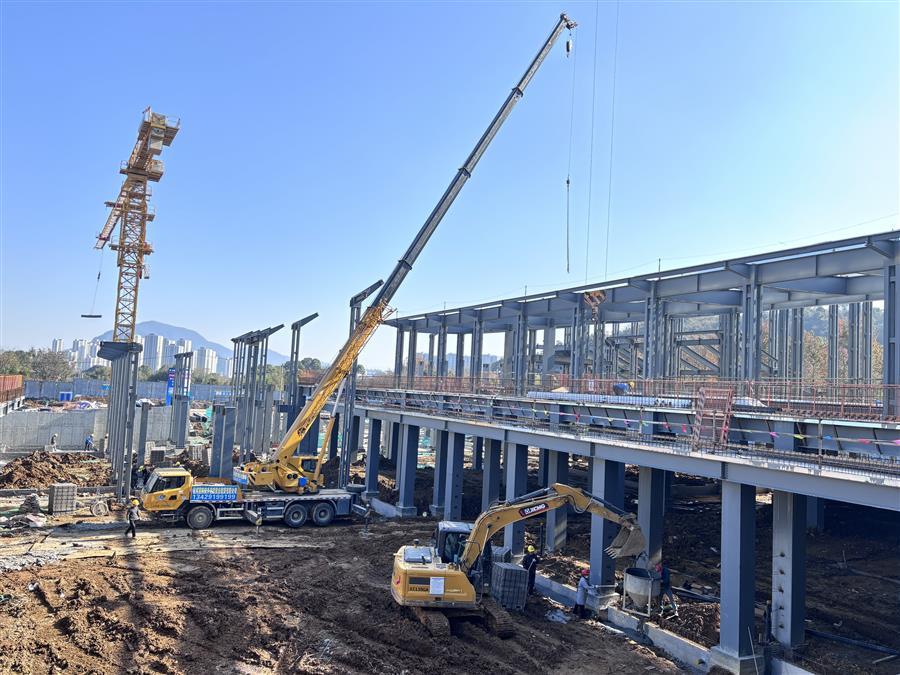 項目施工現(xiàn)場,機器轟鳴,工程車輛來回穿梭,工人們在各點位開展墊層、樓承板澆筑、鋼筋綁扎、栓釘焊接、基礎(chǔ)砌磚、屋面底板和鋼結(jié)構(gòu)梁柱安裝等施工作業(yè),處處涌現(xiàn)“冬忙”景象。